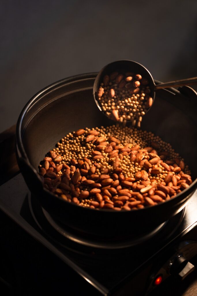 まめ秀では、豆本来の美味しさを極限まで引き出すために、素材選びから製法、そして鮮度のすべてにこだわっています。看板商品「石煎り落花生」はじっくりと火を通すことで、自然な甘みと、カリッとした心地よい歯ごたえを引き出しています。